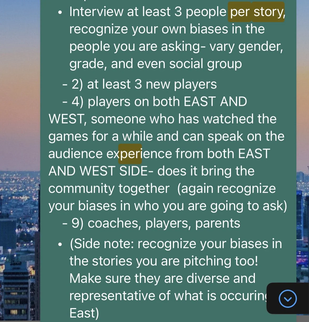 This was a message I sent to Sports editors hoping to ensure that there are enough interviews for the story they were pitching. I also suggested that they recognize biases in who they are asking including gender, grade, and social group.